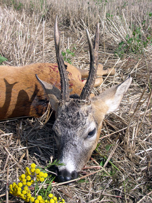 9. August 2005 [Bakonysarkany] Was ein Bock aufführen muss, bis er zum Beschlag kommt! Die Geiß läuft im Kreis und zieht den Bock an kurzer, unsichtbarer Leine nach. Schneller werdend wechselt sie in einen Achter und geht zuletzt hochflüchtig ab ins Meer der Sonnenblumen. Der Bock kracht hinterher. Nach einiger Zeit taucht die Geiß wieder auf, trabt über die Wiese, der Bock verlangsamt seinen Schritt und tut sich nieder. "Jetzt hab ich ihn abgehängt, nun läßt der garstige Kerl mich in Ruhe", denkt die Geiß? Weit gefehlt. Dicht neben dem ausgepumpten Bock bleibt sie stehen und beginnt zu äsen. Von der anderen Seite des Stoppelfelds nähert sich ein Jahrling. Der Bock fährt hoch, erstarrt vor dieser Dreistigkeit und geht auf den Jüngling los. Der nimmt Reißaus. Nun wendet er sich erneut der Geiß zu und sie führt ihn mit Tempo an der Nase herum wie gehabt. Endlich, endlich hält sie still. Er bespringt sie - und rutscht ab. Erst nach dem zweiten oder dritten Versuch scheint er erfolgreich. Er wird ruhig, zupft an den Gräsern und verliert für kurze Zeit das Interesse an der Geiß. Überall dieselben Szenen um diese Zeit - wie im Winkel, so auch am Roman Les am Abend meiner Ankunft. Gegen fünf Uhr morgens erspähe ich den Fuchs. Bevor ich ihn im Sucher habe, raschelt er ins Dickicht zurück. Später springt ein übersehener Knöpfler aufs Blatt. Der Bock jedoch, dessen Anblick mich elektrisiert, treibt am Gegenhang in etwa sechshundert Meter Entfernung. Weitläufig umschlage ich ihn des Windes und der Deckung wegen. Als ich dem Ziel eine halbe Stunde später näherkomme, sind Geiß und Bock weiter ins Feld hinaus gezogen. Unter einem überhängenden Strauch fixiere ich das Dreibein und harre der Dinge. Die Geiß hat ihren Einstand in unmittelbarer Nähe, soeben hab ich ihre Kitze gesehen. Geiß und Bock treiben weit draußen ihr Spiel, entschwinden meinem Blick in einer Senke. Auch der Kitzfiep bringt sie nicht zurück. Ich entschließe mich, frühstücken zu gehen und mir die Sache später von der anderen Seite her anzusehen. Vom Wind her ist dies ohnehin zu empfehlen. Vorsichtig beziehe ich gegen 0945 auf dem Ansitz mitten im Feld Position. Da! Die Geiß und die beiden Kitze in etwa 120 Meter Entfernung. Wo ist der Bock? Ich blatte. Zu meiner Überraschung keucht er fünf Minuten später heran, hält inne und bleibt im Feuer.