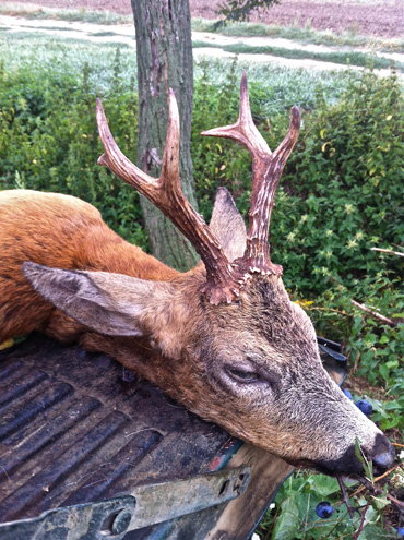 Ich greife nach dem Glas, das Reh wendet den Kopf zum Ansitz und ich friere ein. Ein Bock. Ein sehr guter Bock. Er richtet das Haupt wieder nach vorn. Ich lege behutsam an, spanne, steche ein, ziehe durch. Der Bock kippt im Stand um. Er schlägelt nicht einmal. - "Sechs Jahre" schätzt C. später. Finales Jagdglück. Geweih (grün): 423 g.