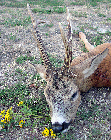 DAS war ein stolzer, alter Herr! 650 Gramm. Die Preisrichter in Tatabanya haben ihm am 5. 11. 2007 nach der CIC-Formel 127,3 Punkte gegeben: Silbermedaille. Auf Gold fehlen 2,7 Punkte. - Wie er zur Strecke gekommen ist? Der eben gefällte Bock hat sich auch gestern morgen weder blicken noch anlocken lassen. Wir waren im Begriff, in einen anderen Revierteil aufzubrechen. Getrappel! Wir fahren herum. Hinter uns fegen zwei Rehe übers Feld. Ein kapitaler Bock stürmt hinter einer Geiß her und verschwindet mit ihr in der Dickung, die die Felder trennt. Der Wind verbietet ein Anpirschen von unserem Standort aus. Wir umschlagen die Dickung weiträumig und nähern uns vorsichtig von der anderen Seite. Hinter einem Strohballen beziehen wir Position.