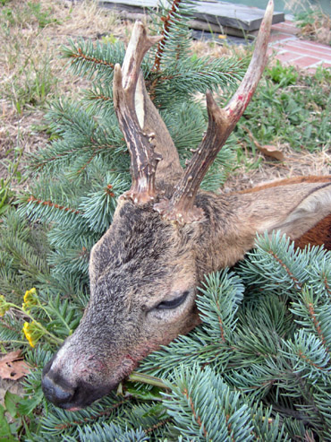 [Bakonysarkany] Die Trophäe sei nicht stark, aber "alt" sei der Bock, hat Laci beim ersten Versuch, ihn anzupirschen, behauptet. "Sechs Jahre", sagt nun auch Zoltan, als er nähertritt und sich zu uns herunter beugt. Im Juni war ich das erste Mal auf diesen Bock aus. Sechs bis sieben Mal bin ich seither allein oder in Begleitung um seinen Einstand herumgepirscht. Auf Distanz hab ich ihn dreimal flüchtig zu Gesicht bekommen. Keine Chance auf einen sicheren Schuss. Heute war es soweit. "Drei Jahre" widerspreche ich Zoltan nüchtern. Der Bock hat ein schmales, graues, alt und mürrisch wirkendes Gesicht. Die Stangen freilich haben an der Basis wenig Masse. Ich prüfe mit dem Daumen die Kunden. Sie fühlen sich scharf an. Zoltan wiegt den Kopf. "Mindestens vier Jahre" tritt er einen Teilrückzug an.