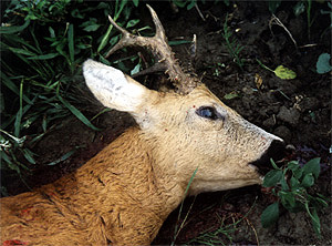 19. Juli 2003 [Bakonysarkany] Kein Bock weit und breit. Es ist halb acht. Seit vier Uhr morgens bin ich unterwegs. Ich schlage den Weg zum Jagdhaus ein und brüte über mögliche Ursachen der mißlichen Pirsch. Heftiger Wind, leere Felder, dürre Wiesen, Wilderer... dennoch hat Fred gestern abend auf Anhieb seinen Sechser erlegt. Er hat gut schlafen. Mithilfe des Frontladers richten wir nach dem Frühstück den Hochsitz auf, den der Wind im Frühjahr umgeworfen hat. Selbst zu fünft, so Peter, seien sie außerstande gewesen, das Ungetüm aus Akazienholz zu heben. Wir reparieren die beschädigten Stellen und verspreizen die Steher zusätzlich. Ein Wildacker liegt vor dem Sitz. Im Mai habe ich hier einen Jahrling erlegt, die Büchse angestrichen am liegenden Gerüst. Seither ist dieser Revierteil kaum bejagt worden. Ich beschliesse, am Abend hier anzusitzen. --- Der Wind kommt von rechts. Ich richte mir eine Armstütze zum Schuss nach dieser Seite ein. Ein Schmalreh quert die Szene. Kurz darauf zieht weit oben ein Sechser gegen den Wind aus. Ich nehme ihn prüfend ins Visier. Es sind über 200 Meter. Er äst und bummelt weiter nach Westen. Ich entscheide mich gegen den Weitschuß, entspanne mich und hebe den Kopf. Da nehme ich Bewegung im Wildacker wahr. Suchend schwenke ich den Lauf. Im Glas taucht das Haupt eines Bocks auf kräftigem Träger auf. Sein dunkles Gehörn ist gedrungen und bis in die Ecken rauh verperlt. Er verhofft gerade und ich zaudere nicht [2030 Uhr / .30-06, 11 g]. Es ist 2100 Uhr. Aufgebrochen liegt der Bock unter dem Hochsitz. Bis zum Einbruch der Dunkelheit sichte ich zwei Geißen, einen Bock, sieben Stück Rotwild, vier Stück Damwild. Spielerisch jagen die Kälber beider Hirscharten einander hin und her. Den Rotwilddamen scheint dies zu missfallen. Sie verscheuchen die Damkälber, wenn sie näher kommen. "Spiel nicht mit den Schmuddelkindern..." fällt mir Degenhardts Lied dazu ein. Um 2200 Uhr höre ich Peters Wagen. Ein so stark verperltes Gehörn hat er hier noch nicht gesehen.